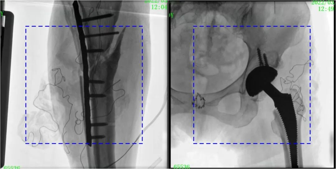 普愛醫(yī)療大平板一體式C形臂圖像與傳統(tǒng)圖像對比(藍色虛線內(nèi)為傳統(tǒng)21CM×21CM平板的成像區(qū)域)