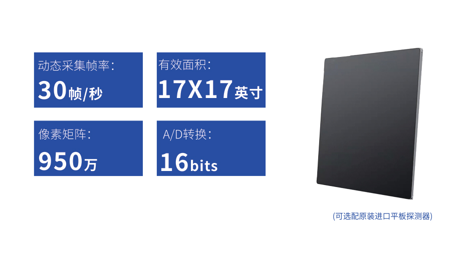 ● 17*17英寸的超高清像素動態平板探測器,更大的視野范圍,無需移動即可觀察整個動態過程,避免拖尾、噪聲對圖像的影響;